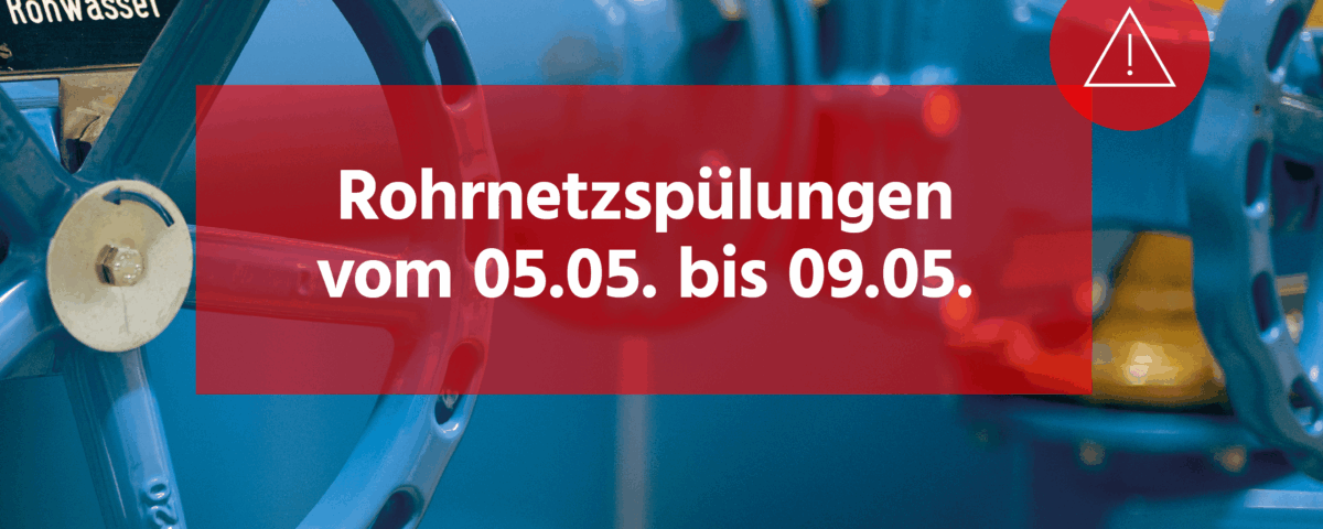 Zur Entfernung von Ablagerungen in den Wasserrohren wird vom 05.05. bis 09.05.2025 in der Zeit von 20.00 bis 8.00 Uhr eine Rohrnetzspülung durchgeführt. Vereinzelte Versorgungsgebiete sind davon betroffen. Den genauen Zeitpunkt, wann Ihr Versorgungsabschnitt gespült wird, teilen wir Ihnen durch Wurfzettel in Ihre Briefkästen mit.